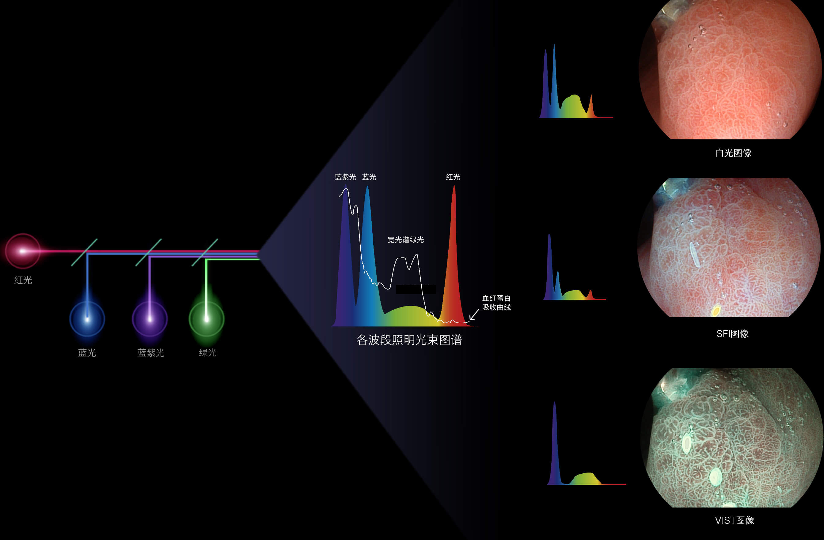 1xBET新开发的内镜染色技术,主要是基于多波长LED 光源的开发,VLS-55Q 四波长LED 光源是由四个不同颜色的LED光按照相应照明模式所规定的特定发光比例进行合束后形成,合束后形成的照明光的光谱由红光、绿光、蓝光及蓝紫光这四个不同的波段范围构成。具有更高光谱自由度,通过光谱比例的控制,实现了聚谱成像技术,英文全称为“Spectral Focused Imaging, SFI”,缩写为“SFI”和光电复合染色成像技术,英文全称为“Versatile Intelligent Staining Technology, VIST”,缩写为“VIST”。